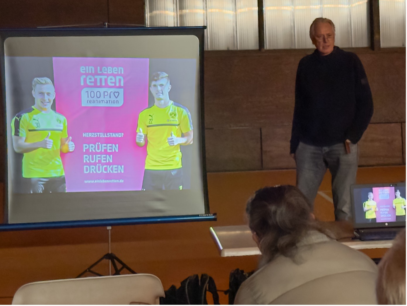 Den ersten Vortrag des Abends hielt Dr. Bernhard Lodde zum Thema „Reanimation für Laien“, also lebensrettende Sofortmaßnahmen bei einem Herz-Kreislauf-Notfall, die von medizinischen Nicht-Fachkräften durchgeführt werden.