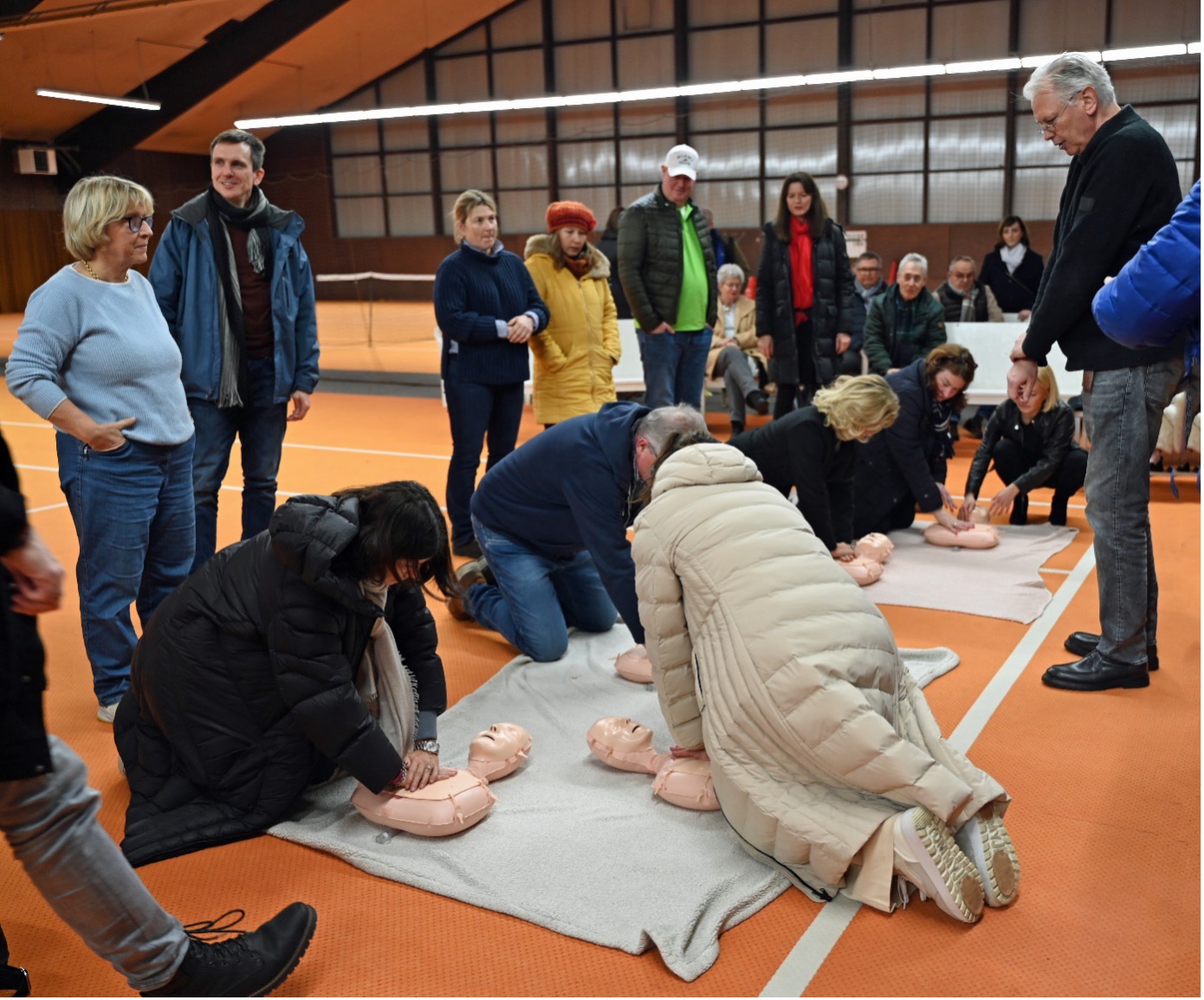 Im Anschluss an die Vorträge wurde es praktisch: An Reanimationspuppen konnten alle Teilnehmenden selbst üben, wie im Ernstfall zu reagieren ist. Darüber hinaus wurde die einfache Anwendung des Defibrillators demonstriert – das Gerät gibt im Notfall klare Schritt-für-Schritt-Sprachanweisungen. Der Defibrillator befindet sich im Winter in der Traglufthalle bzw. im Sommer im Treppenhaus des Klubhauses.